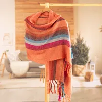 Handwoven Striped Fringed Alpaca Blend Shawl in Salmon 'Amazonian Flowers' Item ID: 2671698124