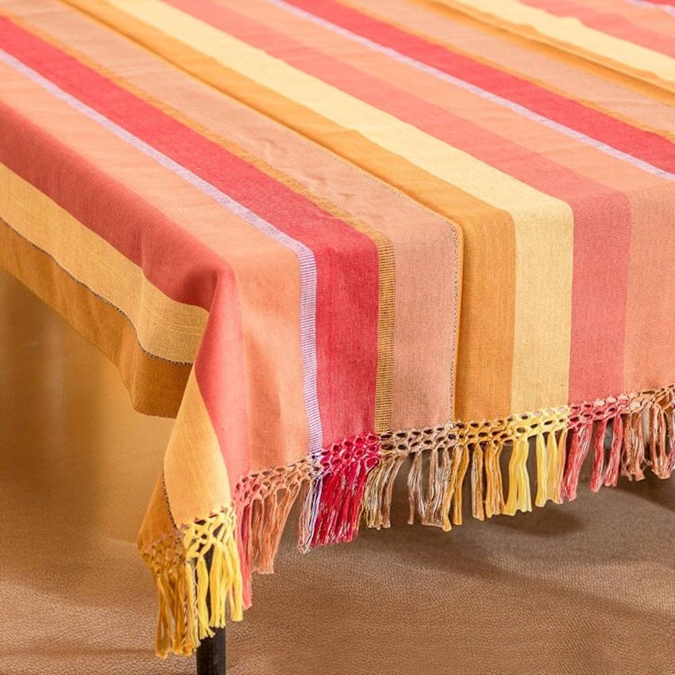 Handwoven Striped Fringed Colorful Cotton Tablecloth 'Dawn in the Countryside' Item ID: 2671626545