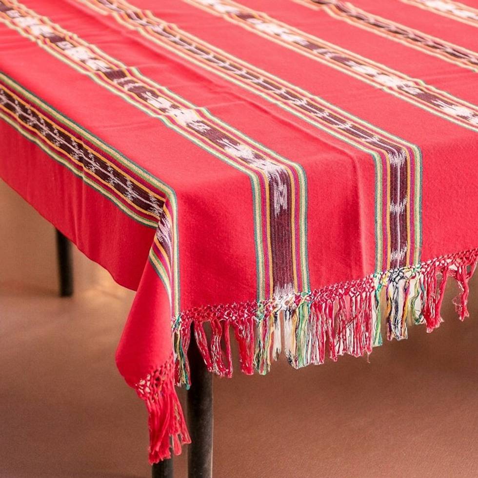 Handwoven Striped Fringed Cotton Tablecloth in Red 'Family Joy' Item ID: 2671626731