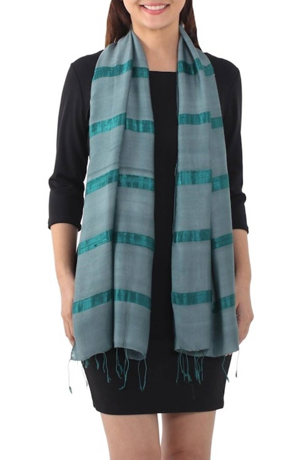 Handwoven Striped Silk Blend Scarf in Viridian from Thailand 'Sound of Nature in Viridian' Item ID: 2671800865