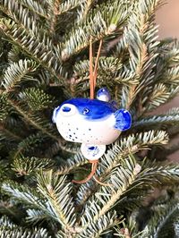 A handmade porcelain pufferfish, ready for hanging, with porcelain clappers that produce a charming clink. The small puffers can be hung from your tree this holiday season, and all designs can be hung inside your house or out on your porch all year long! Hand-painted in cobalt oxide, these pufferfish have intricate details such as fins and speckles, and the hand-painted clappers feature a tiny shrimp design - a favorite snack of pufferfish. Because these pieces are handmade, expect some natural variation in size, sound, and details.