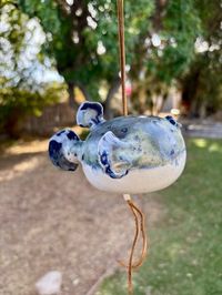 A handmade porcelain pufferfish, ready for hanging, with a hand painted porcelain clapper that produces a charming clink. This puffer can be hung inside your house or out on your porch all year long! This pufferfish is glazed in a speckled grey blue, and the hand-painted clapper features a tiny shrimp design - a favorite snack of pufferfish.