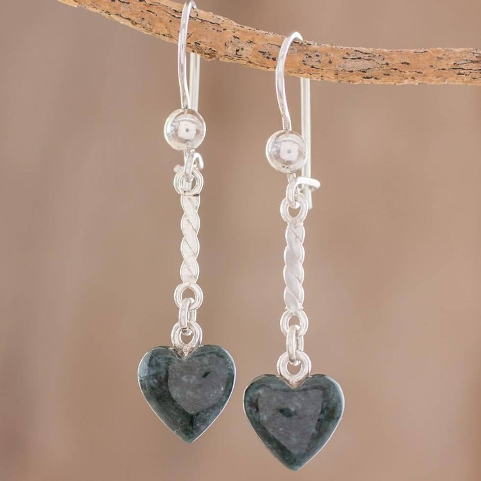 Heart-Shaped Dark Green Jade Dangle Earrings from Guatemala 'Dark Green Spirals of Love' Item ID: 2669923505