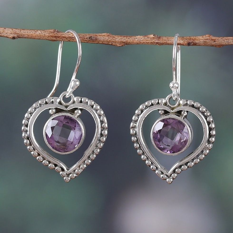 Heart-Shaped Faceted 4-Carat Round Amethyst Dangle Earrings 'Wise Heartbeat' Item ID: 2671783249