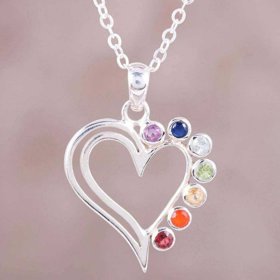 Heart-Shaped Multi-Gemstone Chakra Necklace from India 'Balanced Heart' Item ID: 2671789405