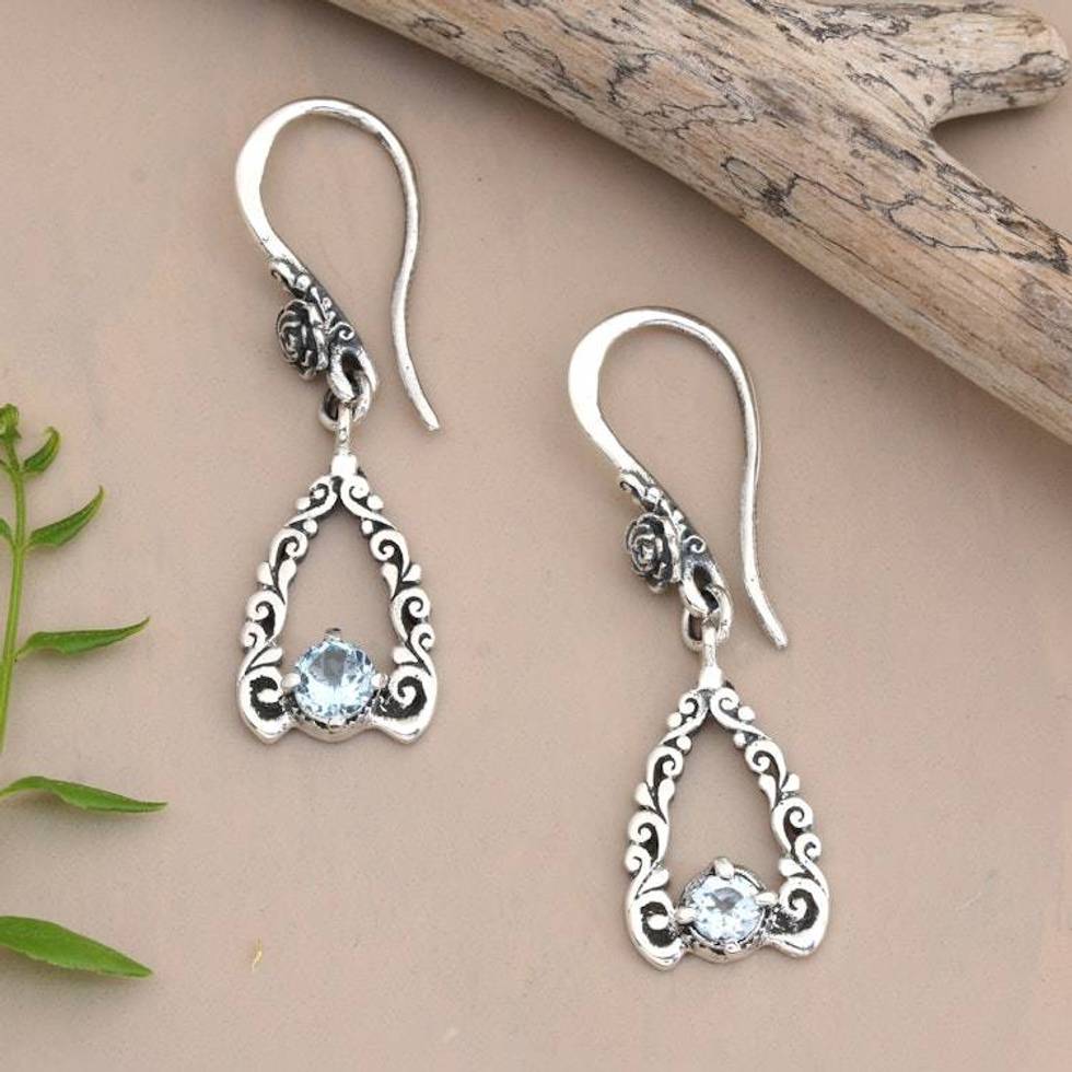 Heart-Shaped Nature-Themed Blue Topaz Silver Dangle Earrings 'Azure Garden' Item ID: 2676661287
