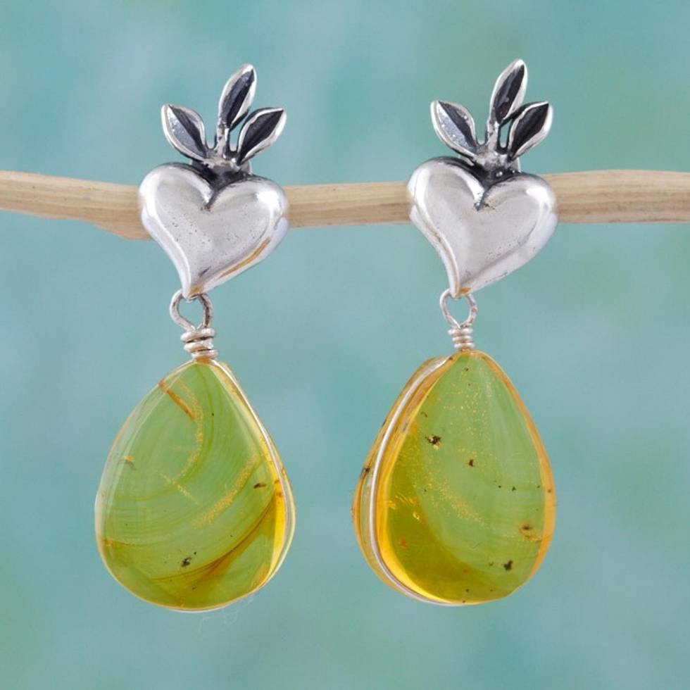 Heart Sterling Silver Earrings with Amber Droplets 'Fern Hearts' Item ID: 2669932465