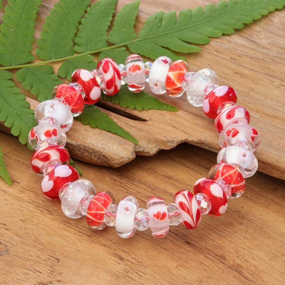 "Brighten your wrist with this vibrant stretch bracelet handcrafted using traditional handblown glass techniques. The beads shimmer with rich red and white shades and intricate heart, floral and leaf patterns, creating a playful yet elegant accent for any outfit. Featuring delicate crystal beads, Thai artisan Alexx Cheng's eye-catching accessory tells a colorful story with each exquisite detail."