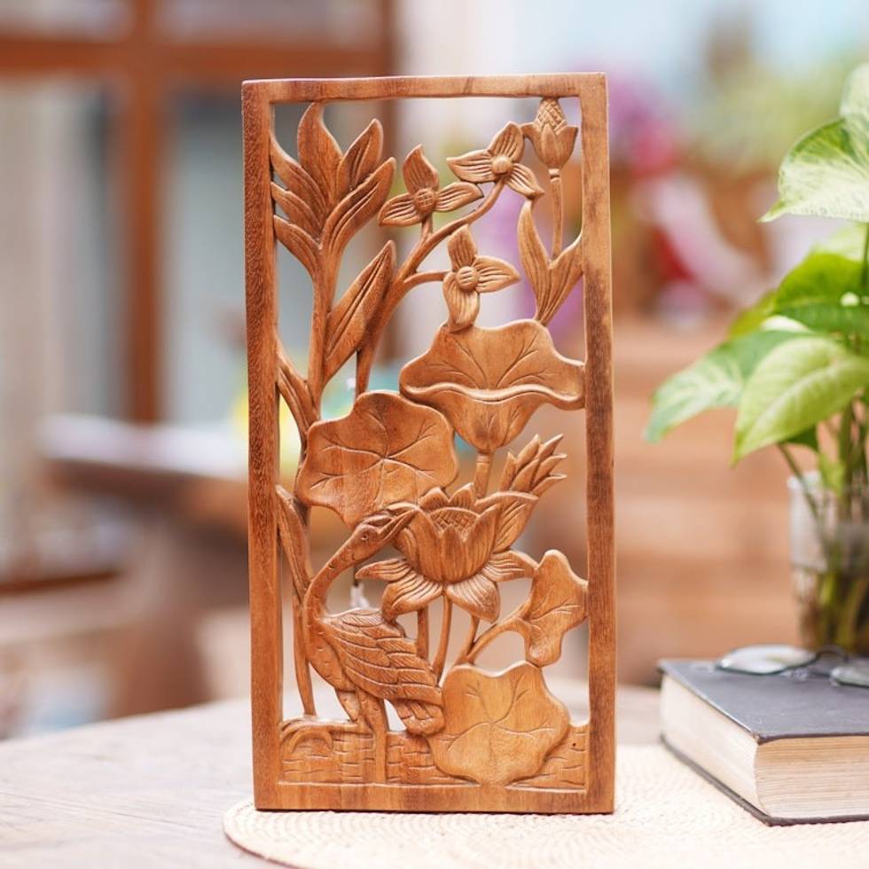 Heron Lilies and Lotus Wall Relief Panel in Hand Carved Wood 'Heron Pond' Item ID: 2671820899