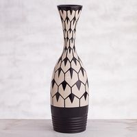 I own 6 pieces of Jesus Rivas geometric cream and black vases. I have these displayed in our living room. The black color is achieved by using mango leaves. It's a complicated, time consuming process. It's an eco-friendly process. Jesus Rivas uses mango leaves to achieve the rich black color for his vases. The vases have a matte finish with minimal gloss. His creativity is truly unique and modern. He has 2 very tall (over 22") vases. His vases are statement pieces that look fantastic grouped with other pieces or alone. I purchased 1 of his taller vases. I grouped several of his vases together in our living room. The tallest vase sits on the floor. We have received many compliments on the vases (pieces) by Jesus Rivas. I highly recommend his vases. You will enjoy these beautiful, modern, geometric vases for many, many years!