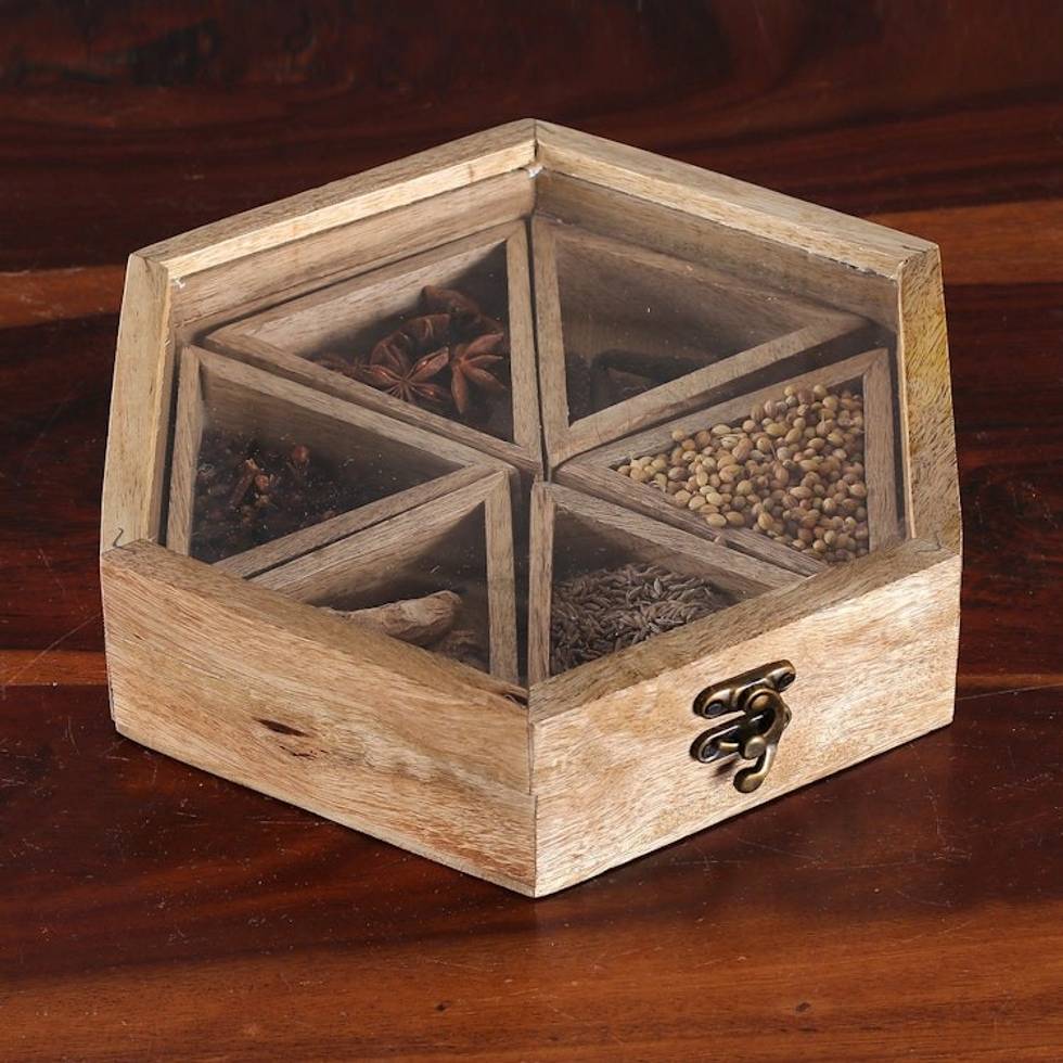 Hexagonal Mango Wood Spice Box with Detachable Compartments 'Hexagonal Flavor' Item ID: 2671625842