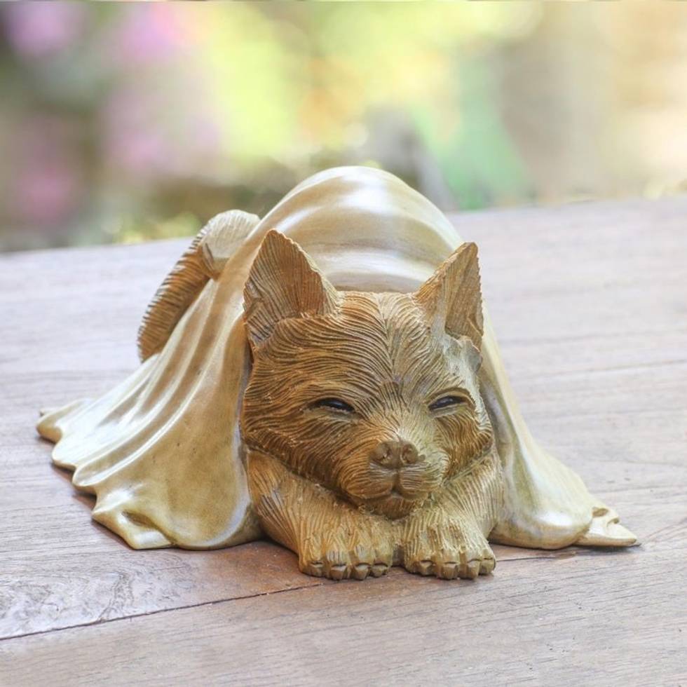 Hibiscus Wood Sculpture of a Cat in a Blanket from Bali 'Chilly Cat' Item ID: 2671744851