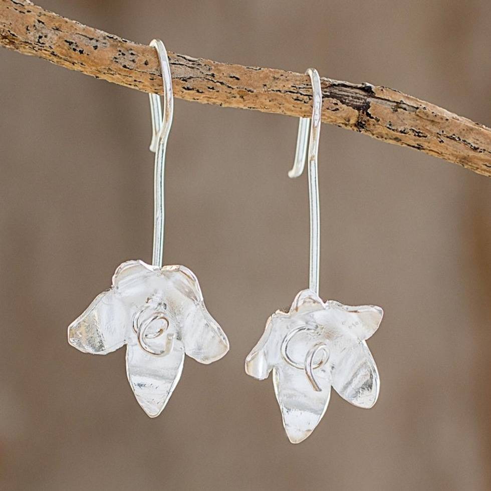 "Initially inspired by dance, Costa Rican artisan Arlyng Mantilla creates lovely jewelry to add to your wardrobe. These drop earrings are handcrafted of sterling silver, featuring floral shapes that fall from hooks. A shining high-polish finish accentuates the center of each flower."