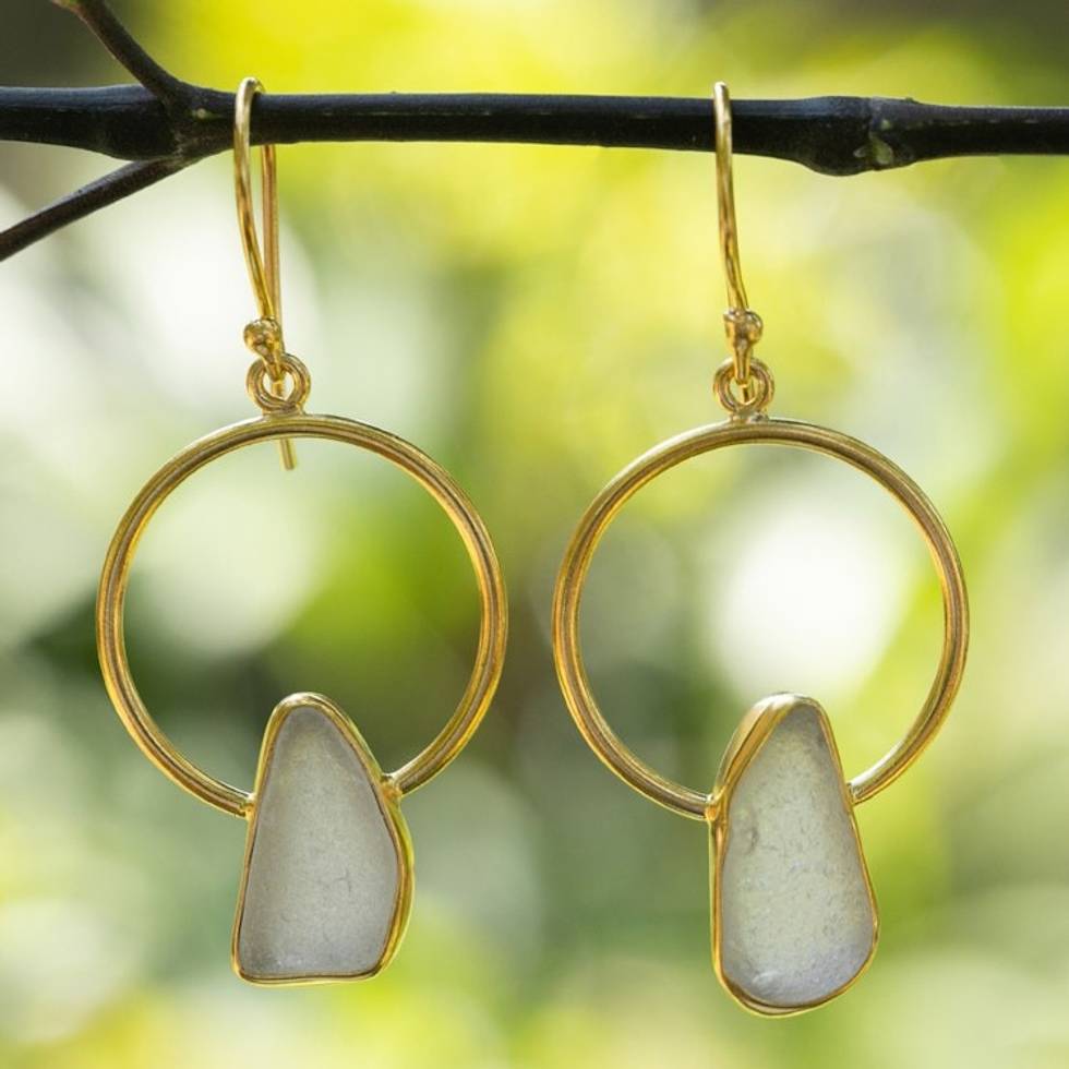 High-Polished 18k Gold-Plated Sea Glass Dangle Earrings 'Ocean Mirror' Item ID: 2671765498