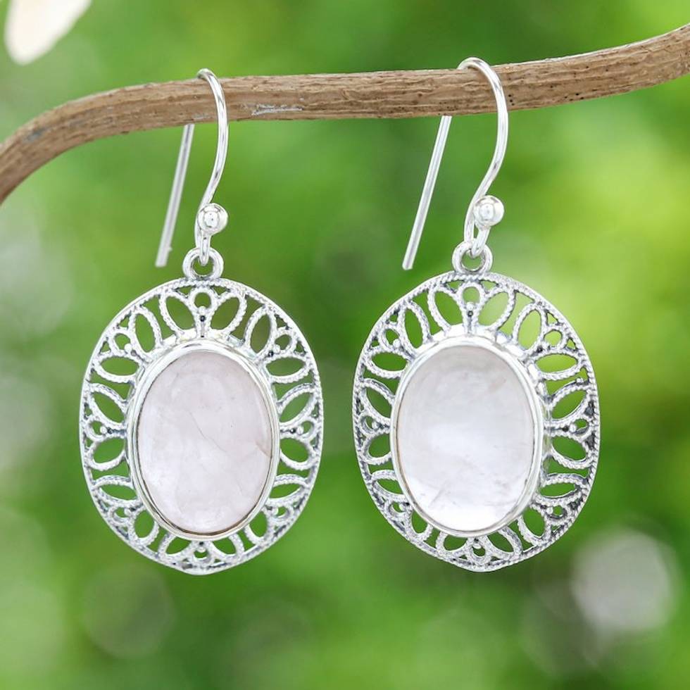 High Polished Floral Natural Rose Quartz Dangle Earrings 'Unconditional Lotus' Item ID: 2671797912