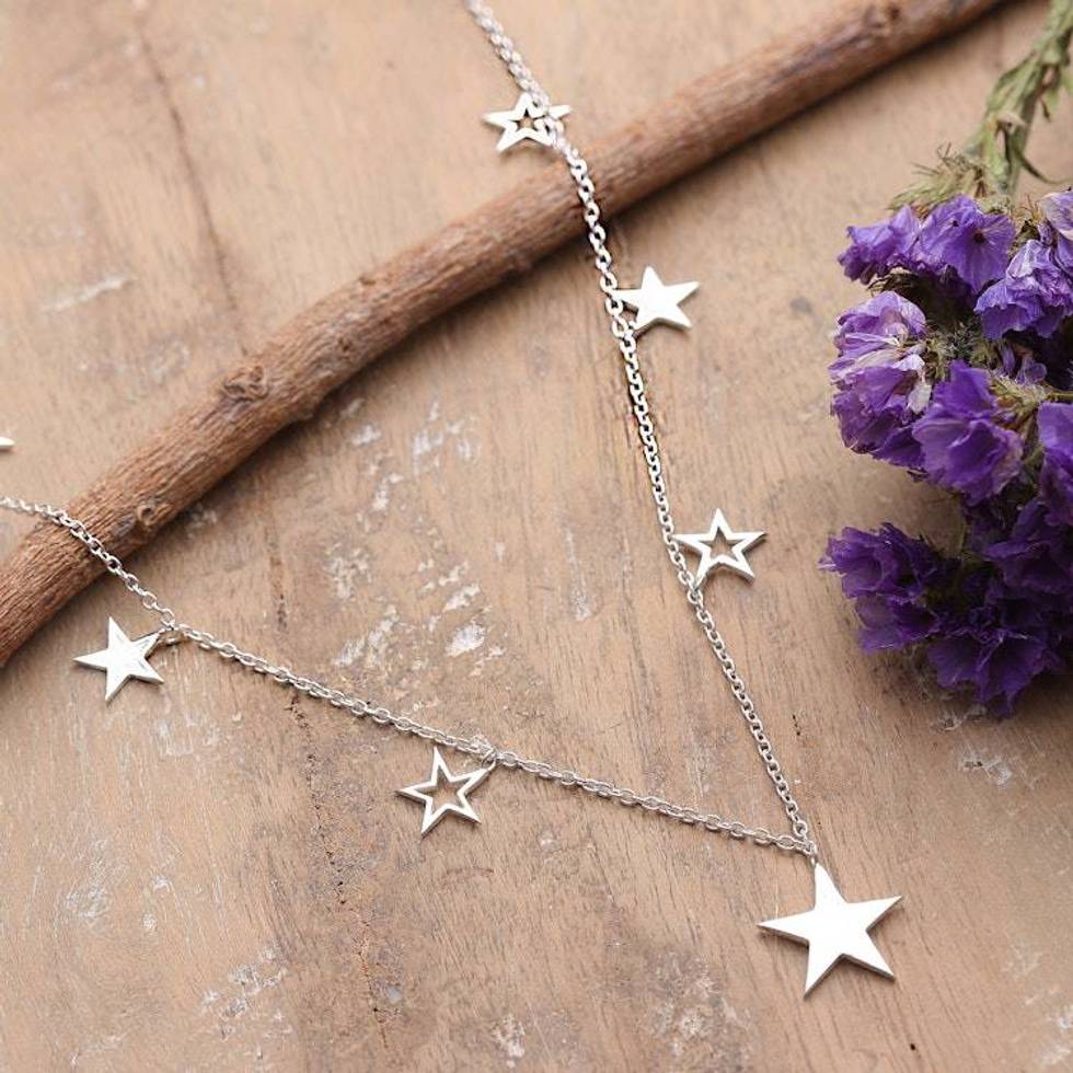 High-Polished Star-Themed Sterling Silver Charm Necklace 'Starry Nights' Item ID: 2676664572