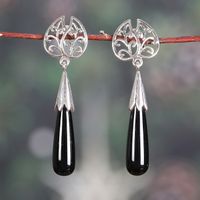 High-Polished Sylvan-Themed Onyx Dangle Earrings from India 'Nocturnal Style' Item ID: 2671781100