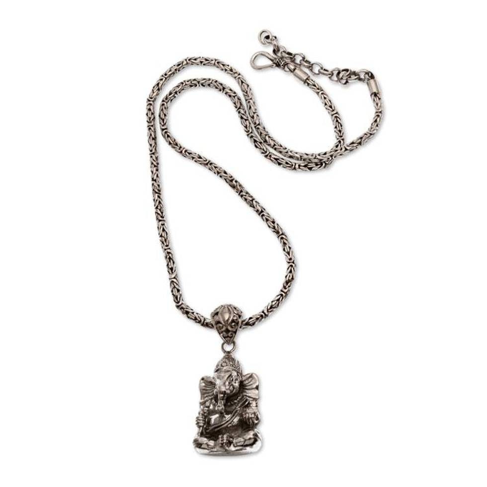 Hindu God Ganesha-Themed Men's Silver Pendant Necklace 'Meditation Ganesha' Item ID: 2676662926