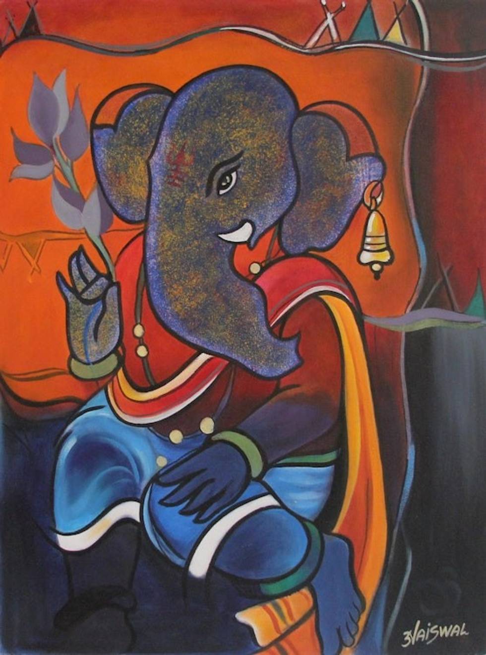 Hinduism Deity Ganesha Vinayak Painting Signed India Arts 'Peaceful Ganesha' Item ID: 2669889401