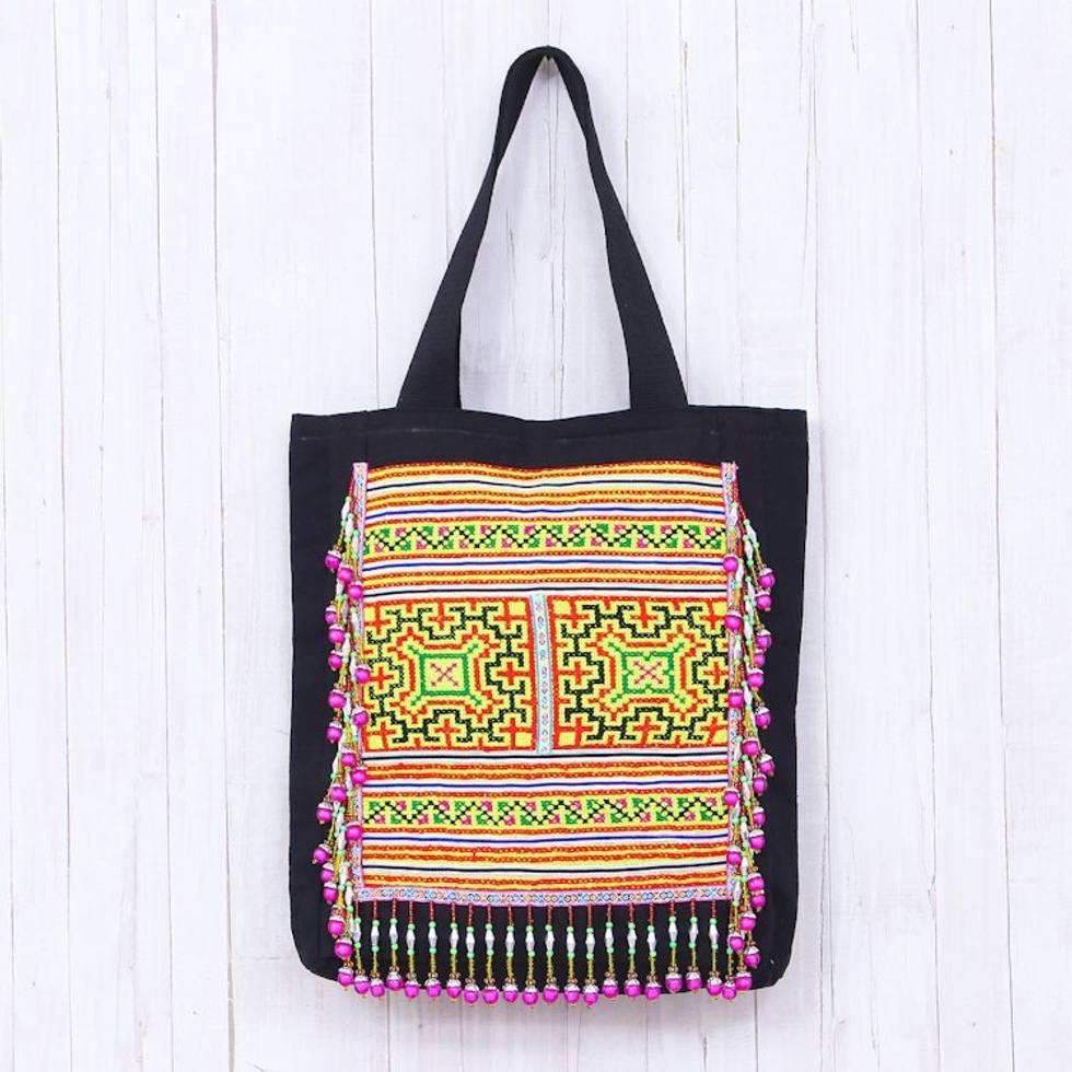 Hmong Cotton Tote Bag with Zippered Interior Pocket 'Shiny Hmong' Item ID: 2671800239