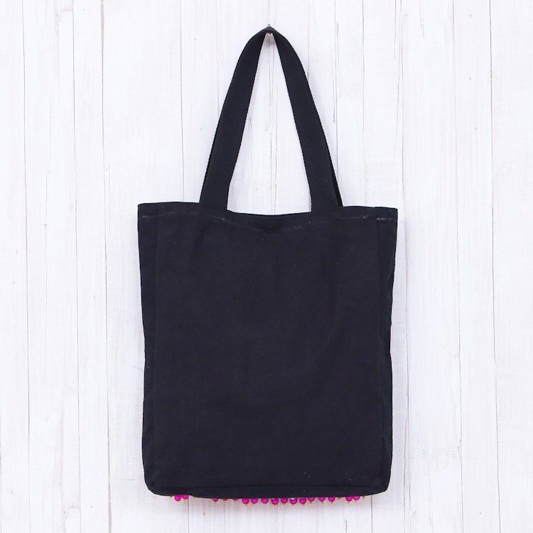 "Nuchsuwan of Thailand creates this eye-catching tote bag with a Hmong cross stitch pattern on a black background with accents of orange, green and yellow. The hill tribe pattern is augmented by beadwork on three sides. Lined in black cotton and featuring a zippered interior pocket, the tote had a magnetic snap for keeping belongings secure."