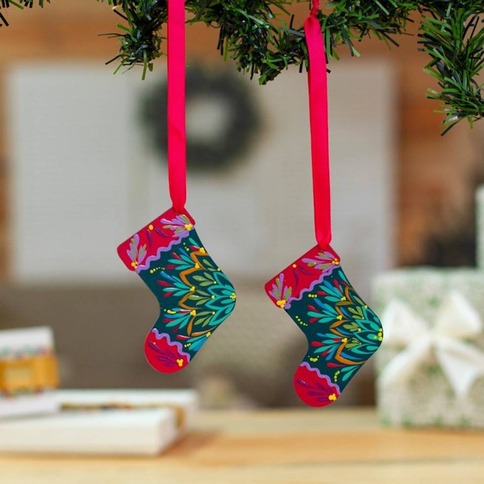 Holiday-Themed Painted Wood Christmas Stocking Ornament Pair 'Holiday Gifts' Item ID: 2671798659