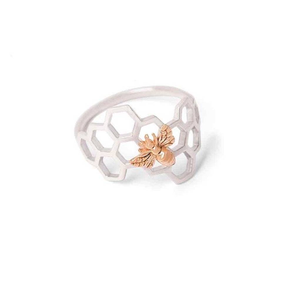A tiny bronze honeybee sits on top of an openwork honeycomb on this adorable ring. In many religions, honeybees are commonly depicted as messengers for the spirits, and are closely associated with the sun. The honeycomb, a collection of hexagons, symbolizes the heart and represents the sweetness of life found within.