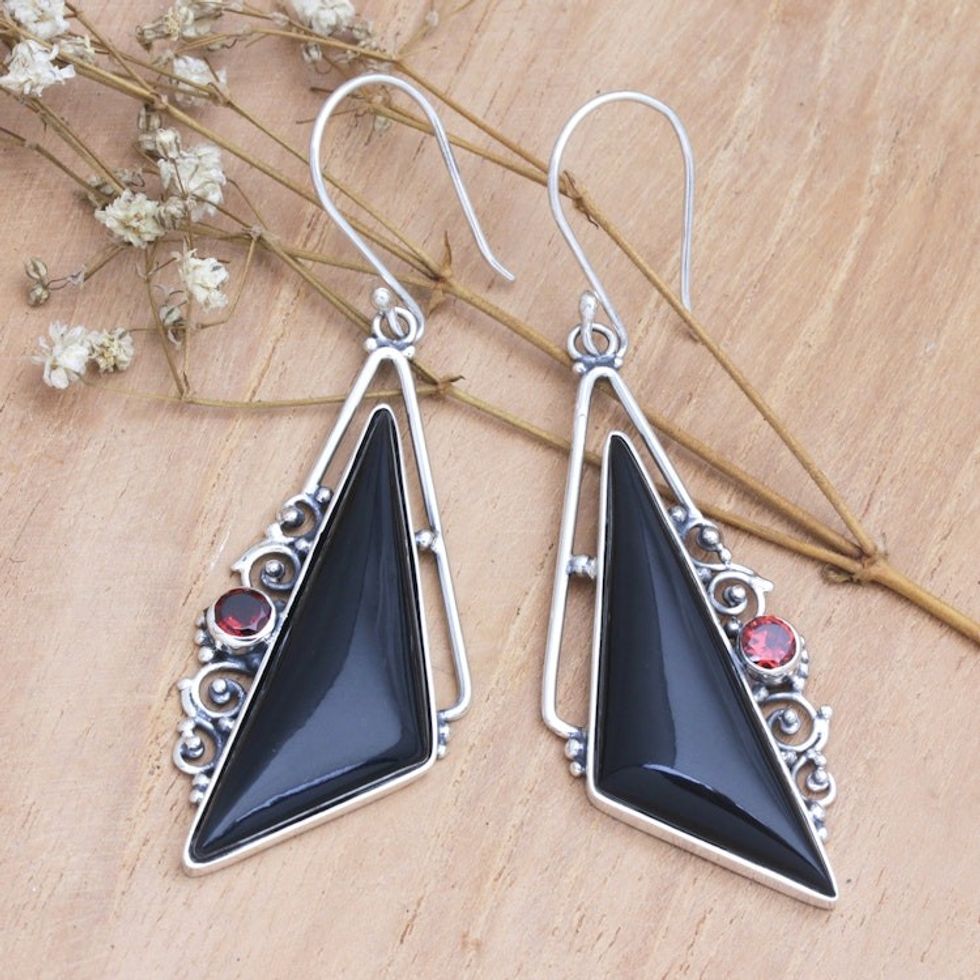 Horn Garnet and Sterling Silver Triangle Dangle Earrings 'Nocturnal Shapes' Item ID: 2671748340
