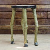 "Shaped like the legs of a horse, the four legs of this Ghanaian accent table are carefully hand-carved by local artisans. Raphat Asigbey designs this animal-themed table, which is accented by a rustic finish. Triangular patterns decorate this table's round top."