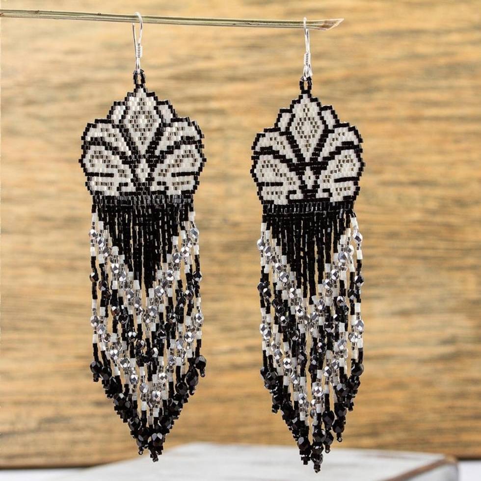 Huichol Beadwork Floral Earrings in Black-White-Grey 'White Blossom' Item ID: 2671808073
