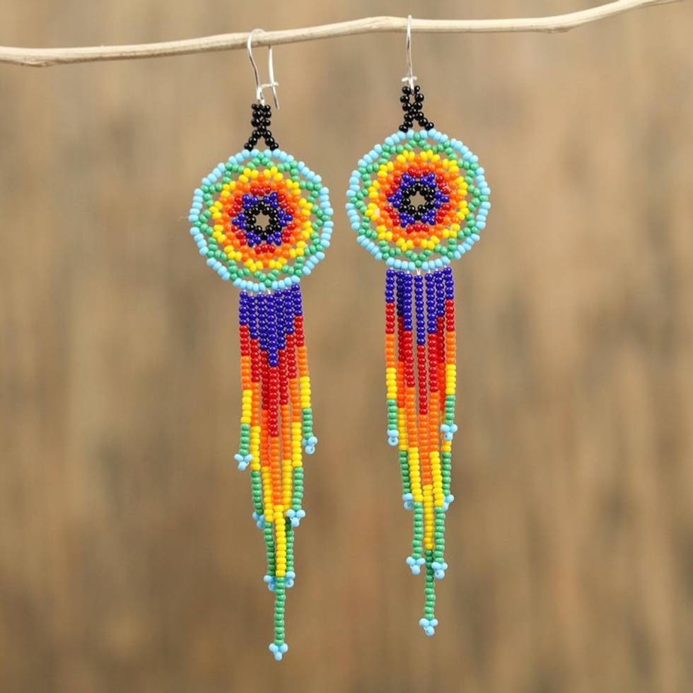 Huichol Colorful Glass Beaded Earrings from Mexico 'Vibrant Huichol Circles' Item ID: 2669933092