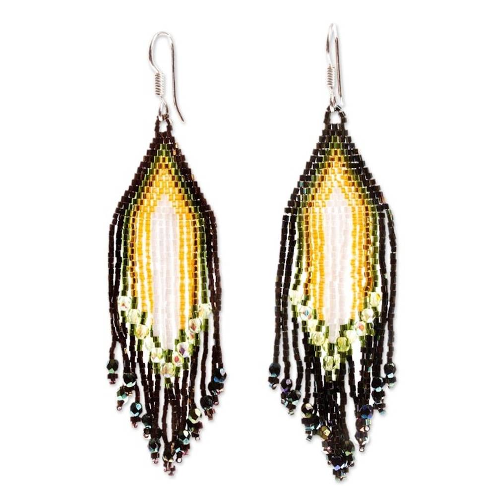 Huichol Espresso-White-Yellow Beadwork Waterfall Earrings 'Espresso and Yellow Rivers' Item ID: 2671808453