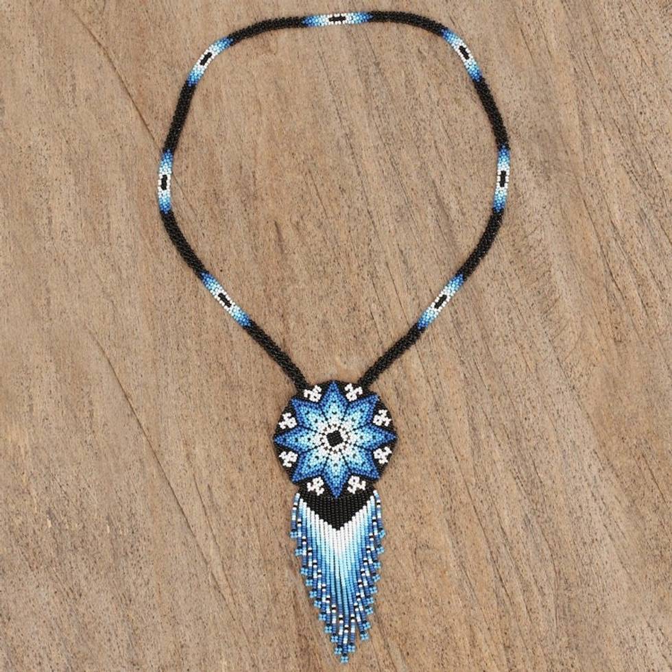 Huichol Glass Beaded Necklace in Blue from Mexico 'Icy Huichol' Item ID: 2671808614