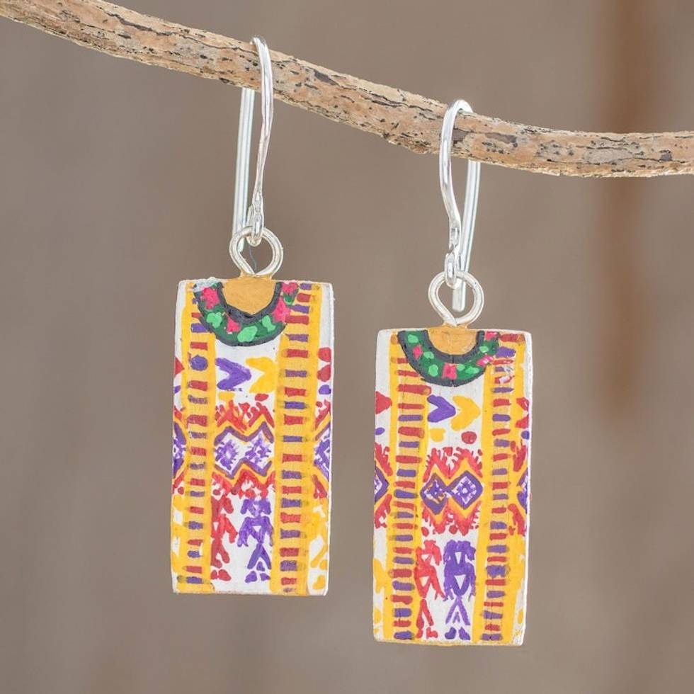 Huipil-Inspired Wood Dangle Earrings from Guatemala 'Xela Marvels' Item ID: 2671776681