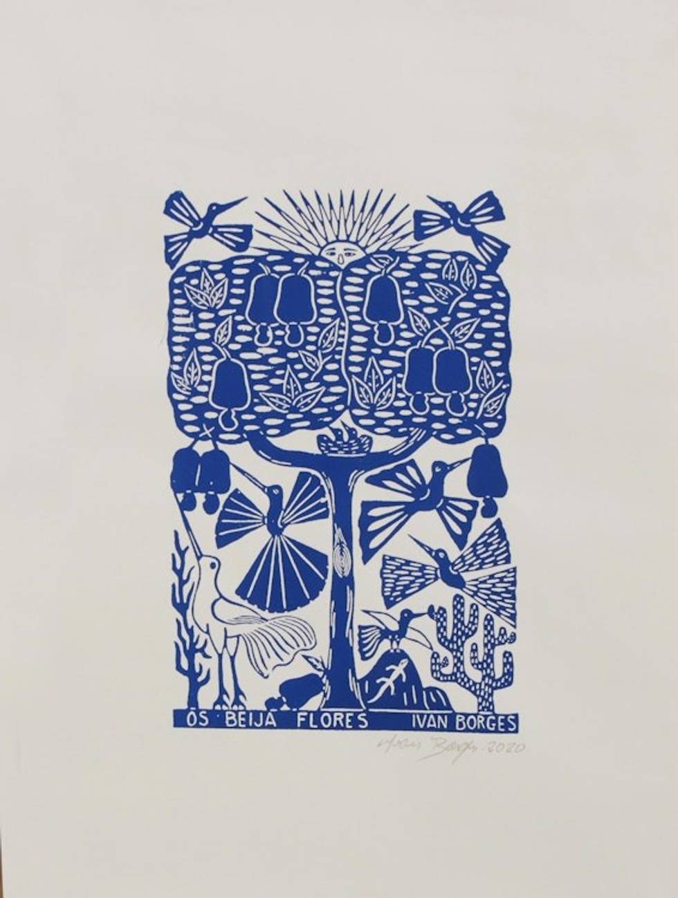 Hummingbird Garden Blue and White Brazilian Woodcut Print 'The Hummingbirds' Item ID: 2669935338