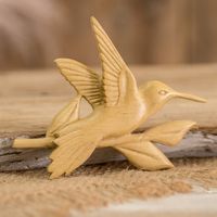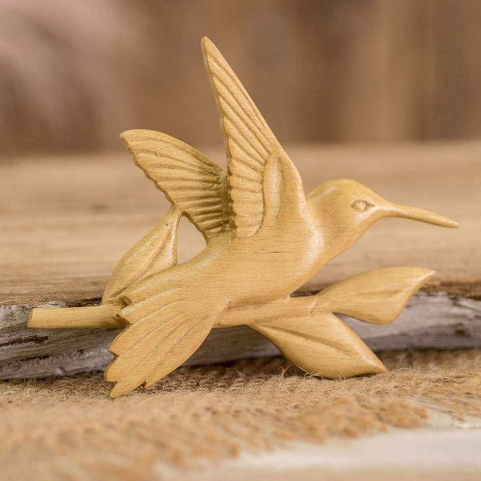 "A hummingbird flapping its wings graces this lovely magnet crafted from white teak wood by Costa Rica's Bryan and Sandra. They carve the wood by hand so meticulously that you can see the details on the bird and the leaves on the branch. A lovely decorative accent for your kitchen or your favorite spot."