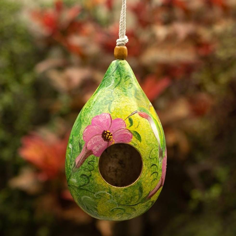 Hummingbird-Themed Green Dried Gourd Bird House from Peru 'Hummingbird Lair' Item ID: 2671820473