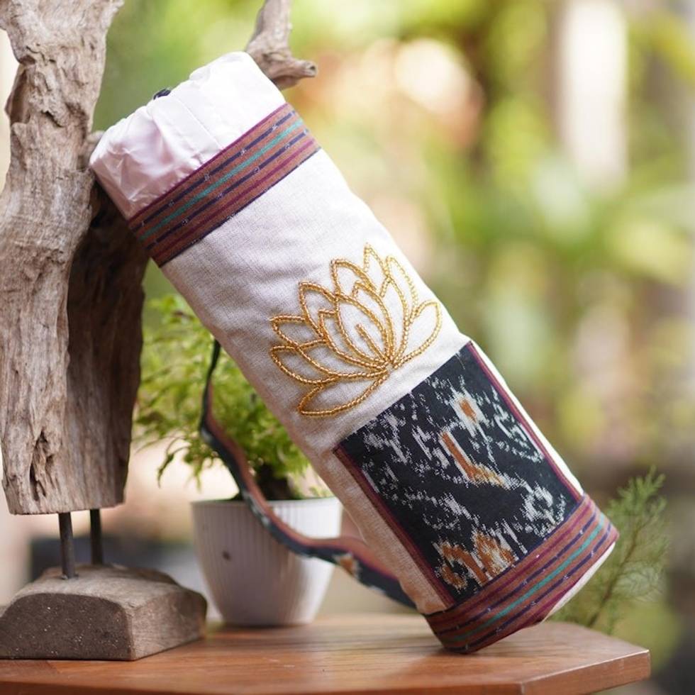 Ikat Cotton Yoga Mat Carrier from Java 'Large Lotus Lagoon in Ivory' Item ID: 2671747293