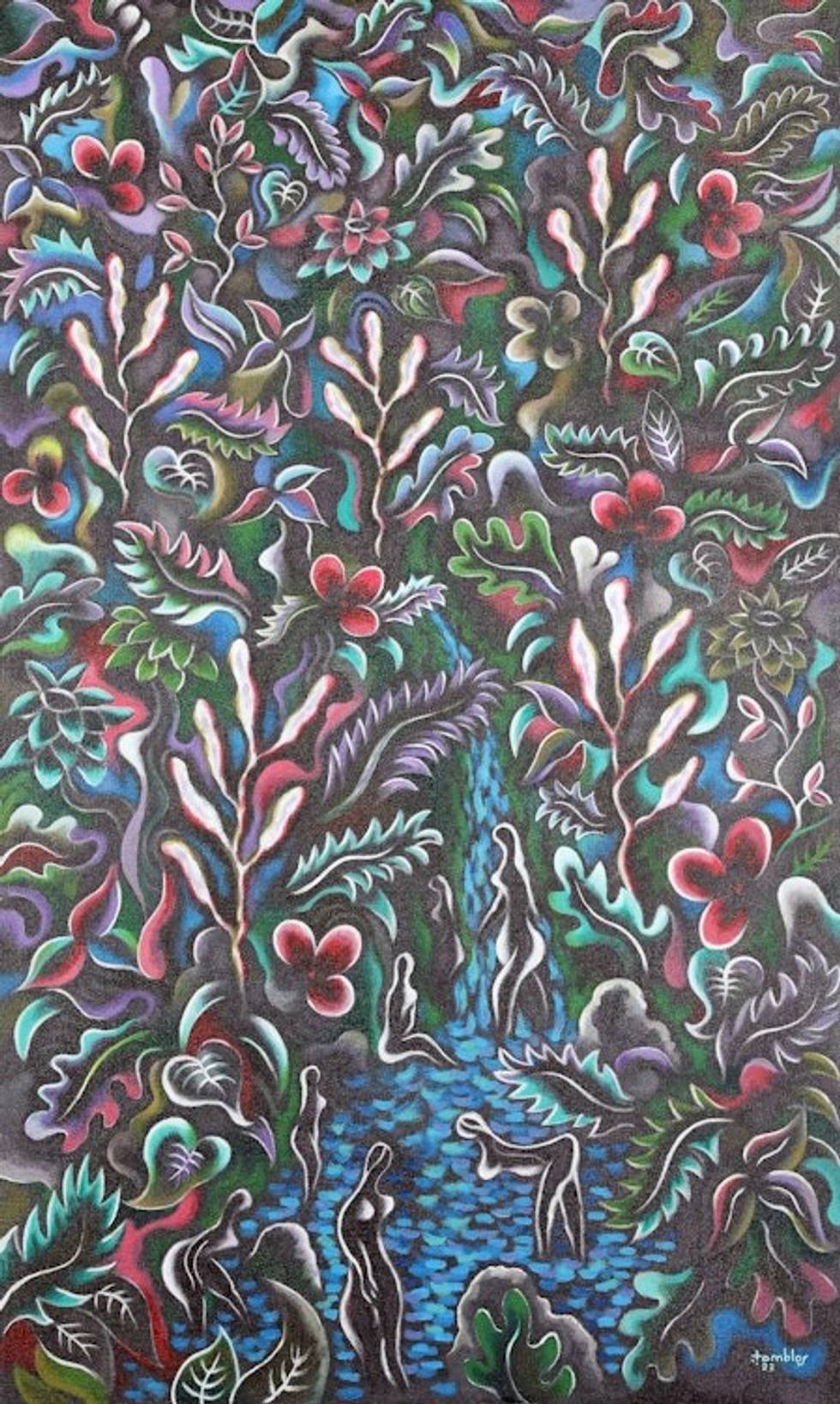 He began painting in 1990 as a self-taught artist. His initial theme was the Balinese rice field, as he elaborated images first on the walls of his home before opting for mixed media paints on paper and canvas. In 1993 Tomblos came under the tutelage of Arie Smit, a renowned artist, focusing especially on color and composition. His paintings have been exhibited throughout Bali.
