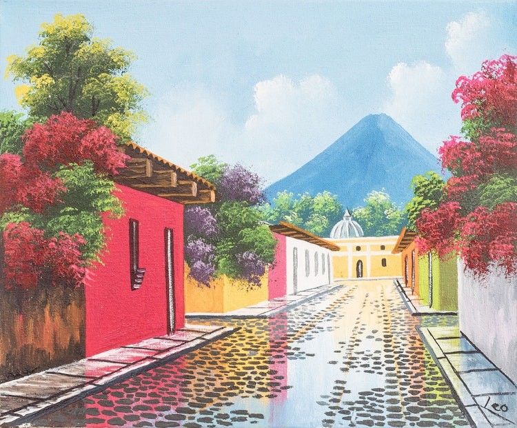 "A volcano seems to embrace Saint Francis Church in Antigua Guatemala as well as several colorful houses and a charming cobblestone street filled with trees and flowers in Hugo Pichiya's lovely composition crafted with oil paints on canvas in an Impressionistic style. The scene invites the beholder to step into this captivating atmosphere and experience the unique allure of Antigua Guatemala.