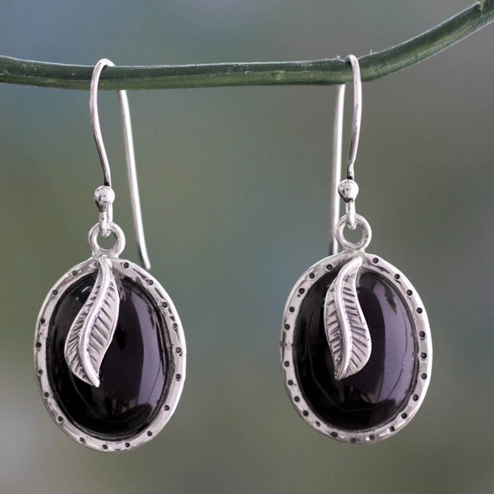 India Fair Trade Onyx and Sterling Silver Dangle Earrings 'Tender Leaves' Item ID: 2671793872