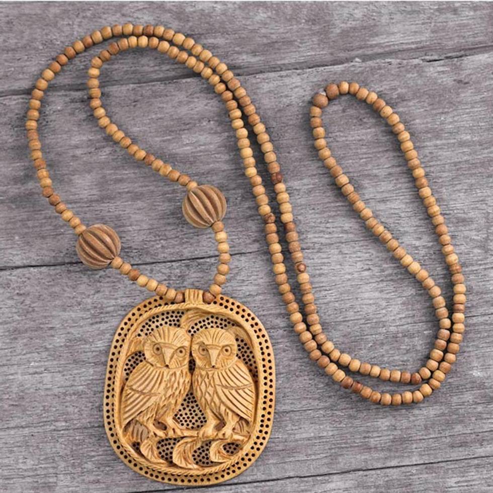 India Wood Jewelry Hand Crafted Necklace 'Owl Romance' Item ID: 2669923773