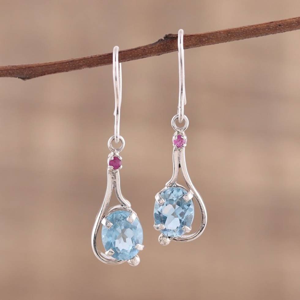 Indian Blue Topaz and Ruby Sterling Silver Dangle Earrings 'Enthralling Sky' Item ID: 2669924123