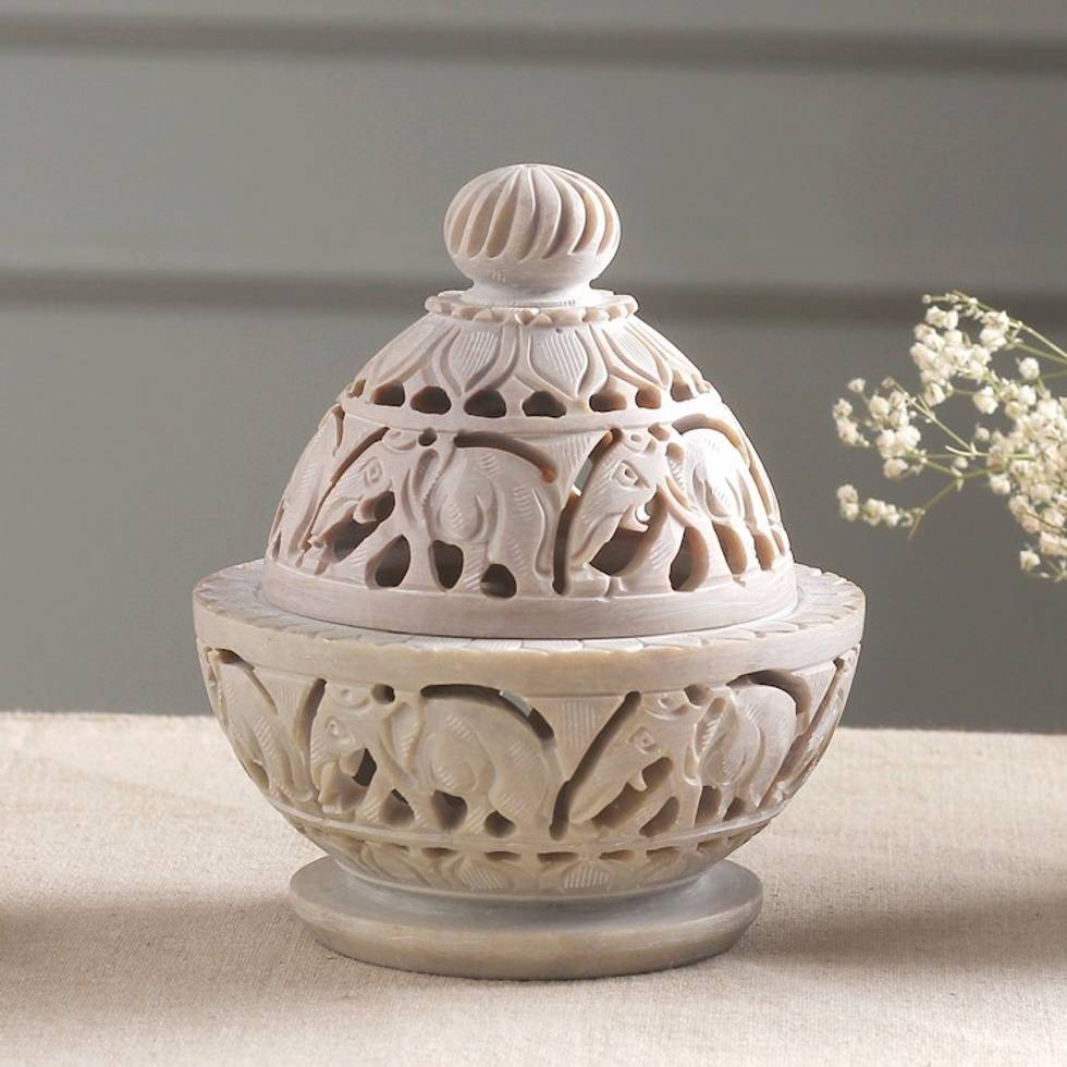 Indian Elephant Theme Hand Carved Soapstone Decorative Jar 'Elephant Parade' Item ID: 2671793846