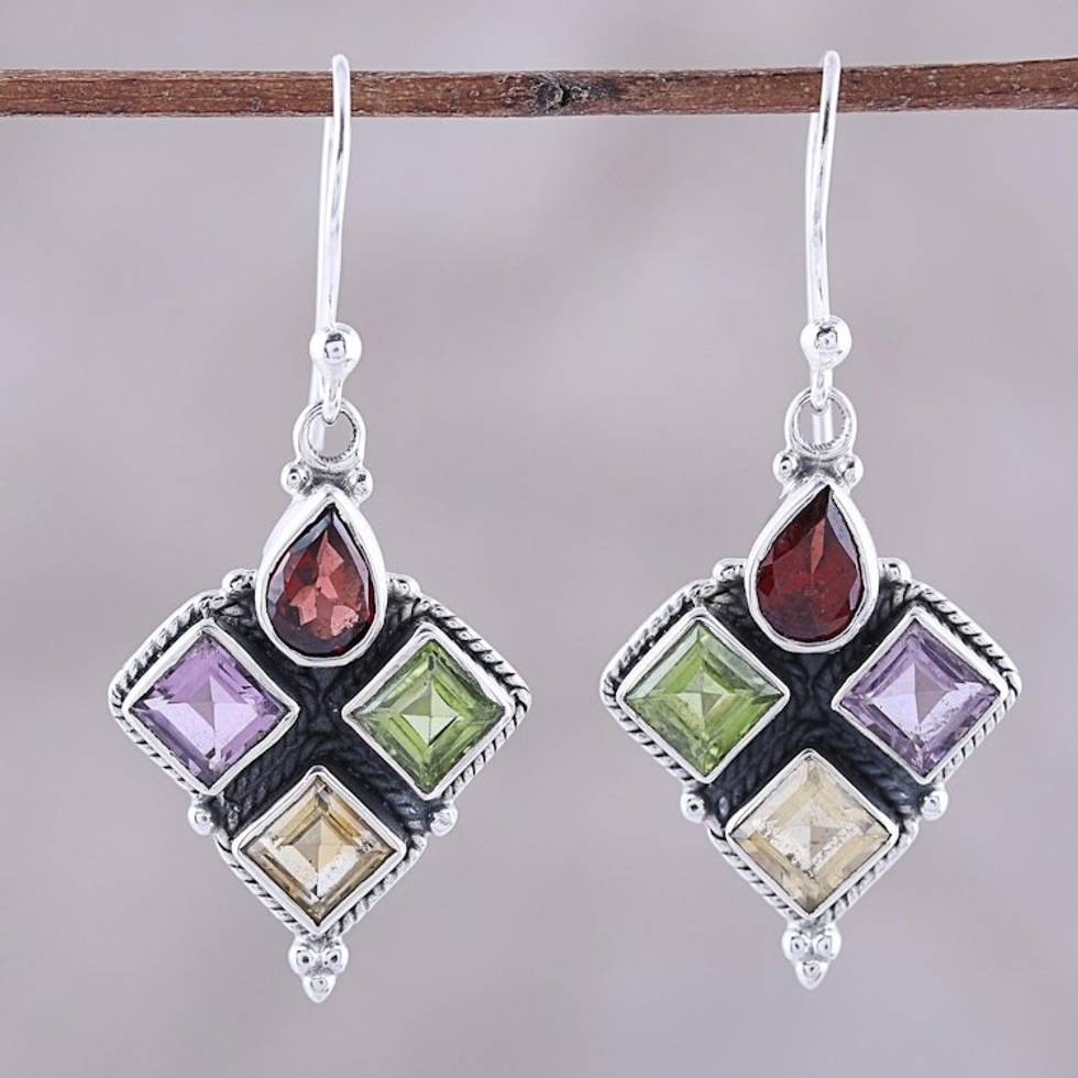 Indian Garnet Citrine Peridot and Amethyst Dangle Earrings 'Sparkling Quartet' Item ID: 2671792130