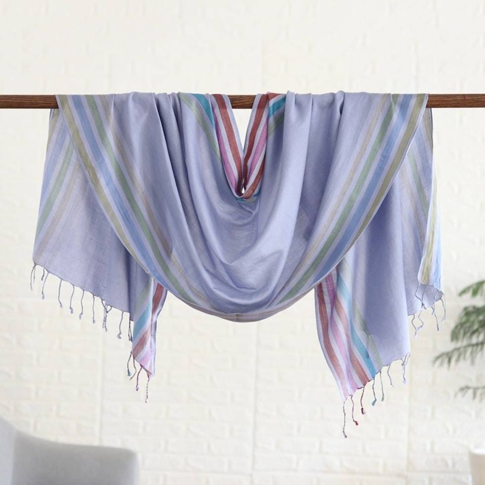 Indian Handloomed Striped Silk Shawl in Steel Blue 'Steel Blue Charm' Item ID: 2669924958