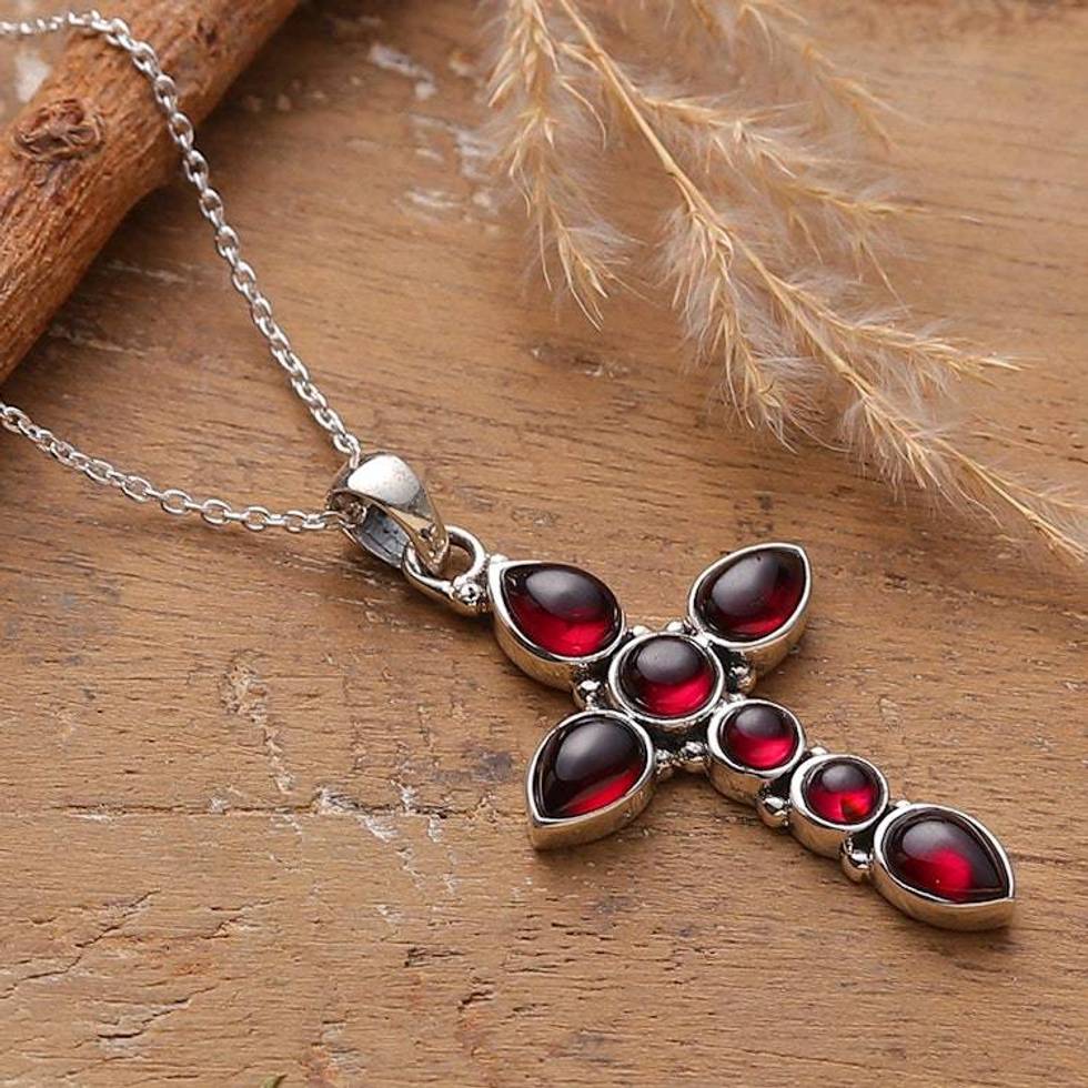 Indian-Made Natural Garnet Cabochon Cross Pendant Necklace 'Sacred Passion' Item ID: 2676665189