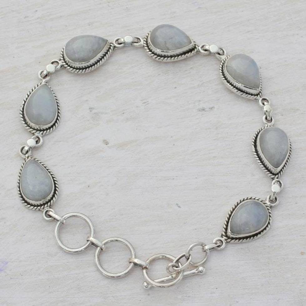 Indian Rainbow Moonstone and Sterling Silver Link Bracelet 'Caressing Rain' Item ID: 2676663783