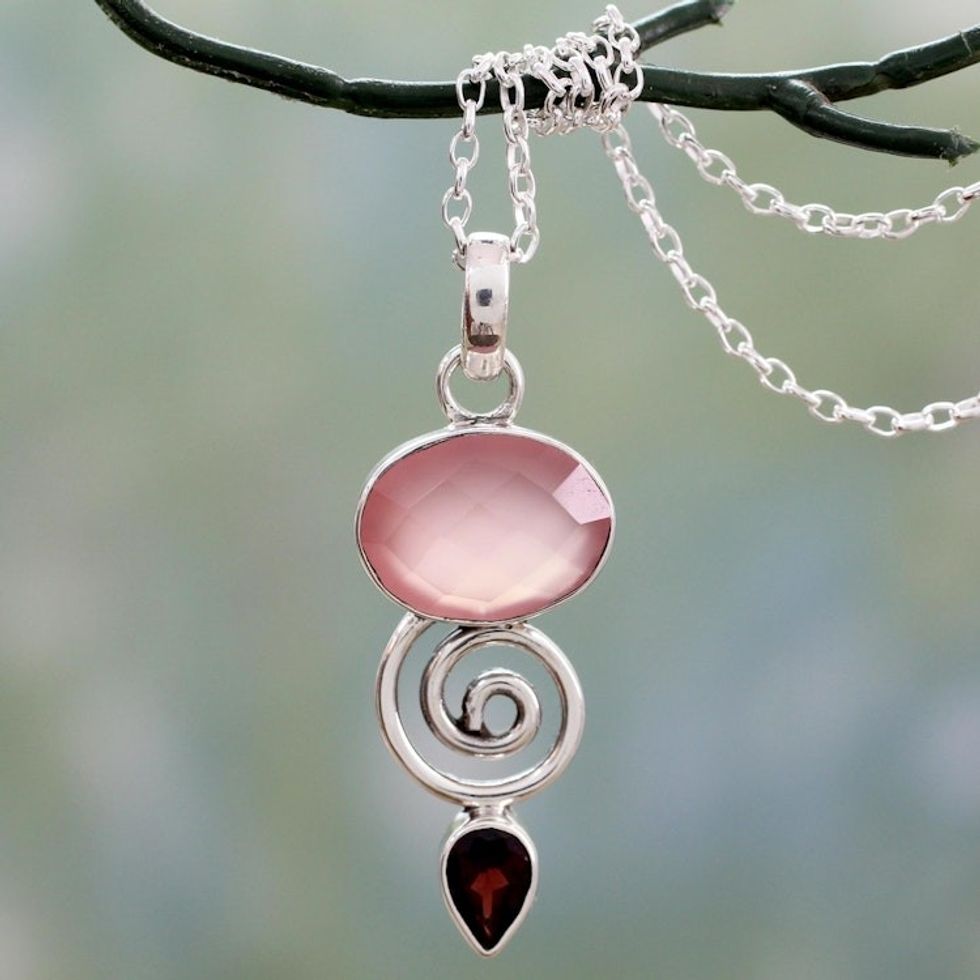 Indian Silver Necklace with Pink Chalcedony and Garnet 'Romantic Journey' Item ID: 2671793745