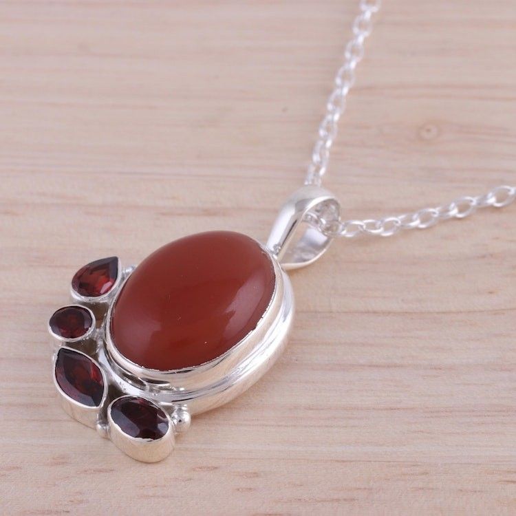 Indian Sterling Silver Garnet and Carnelian Pendant Necklace 'Fire's Embers' Item ID: 2671790074